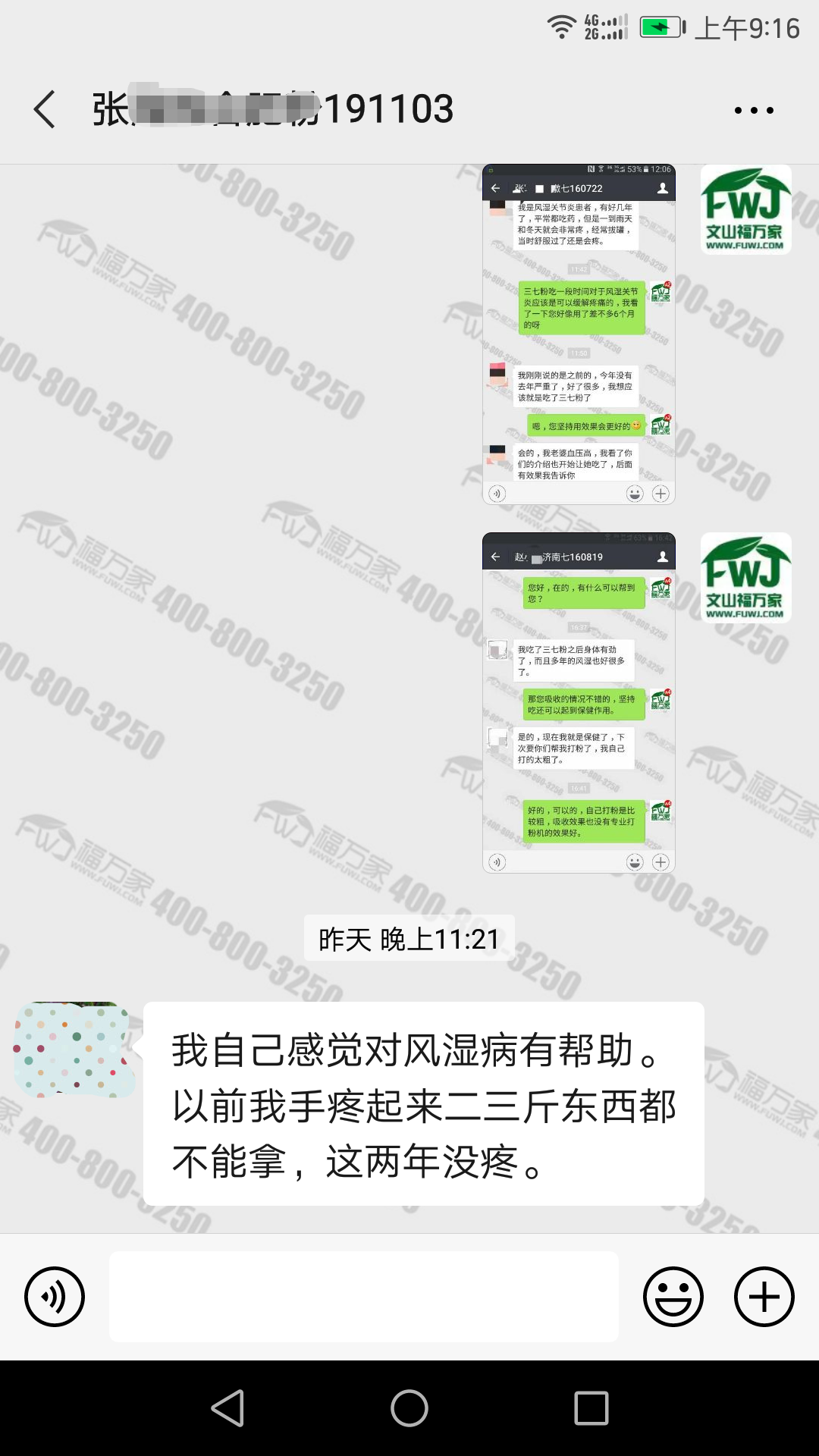 张女士有风湿,手痛的时候两三斤的东西都不能拿。她一直在坚持服用福万家三七,最近两年都没疼了。